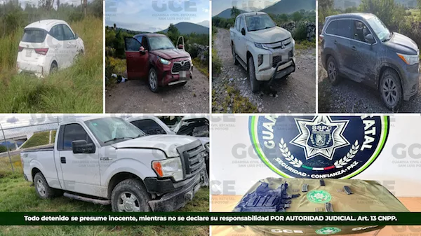 Cabe señalar que, en un camino de terracería, que conduce a la localidad de Santa Lucía, se aseguró un vehículo que posiblemente es parte del parque vehicular de un grupo de delincuentes, se trata de una unidad Toyota, color rojo, que tenía reporte de robo en el municipio de Matehuala. Además, en la colonia La Dichosa, se aseguró una camioneta Ford, de procedencia extranjera, con un chaleco táctico en su interior, tres cargadores para arma larga, 21 cartuchos útiles y una radio frecuencia, además de varios artefactos metálicos manufacturados para dañar neumáticos.