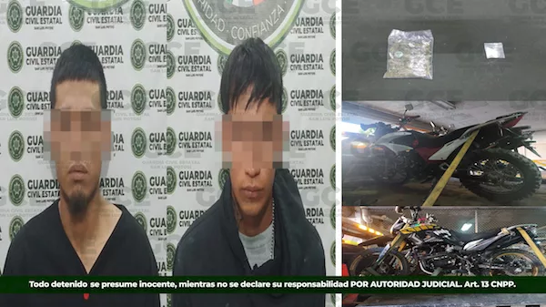Mediante este dispositivo, se les decomisaron dos motocicletas, una de ellas con reporte de robo, en este mismo municipio, otra marca Italika, sin reporte de robo, también se les aseguraron una dosis de marihuana y otra de “cristal”. A su vez, en la célula operativa dos, efectivos de la GCE localizaron en el municipio de Villa de Zaragoza, una motocicleta marca Italika, color gris, con reporte de robo, posiblemente vinculado para el uso de actividades ilícitas.
