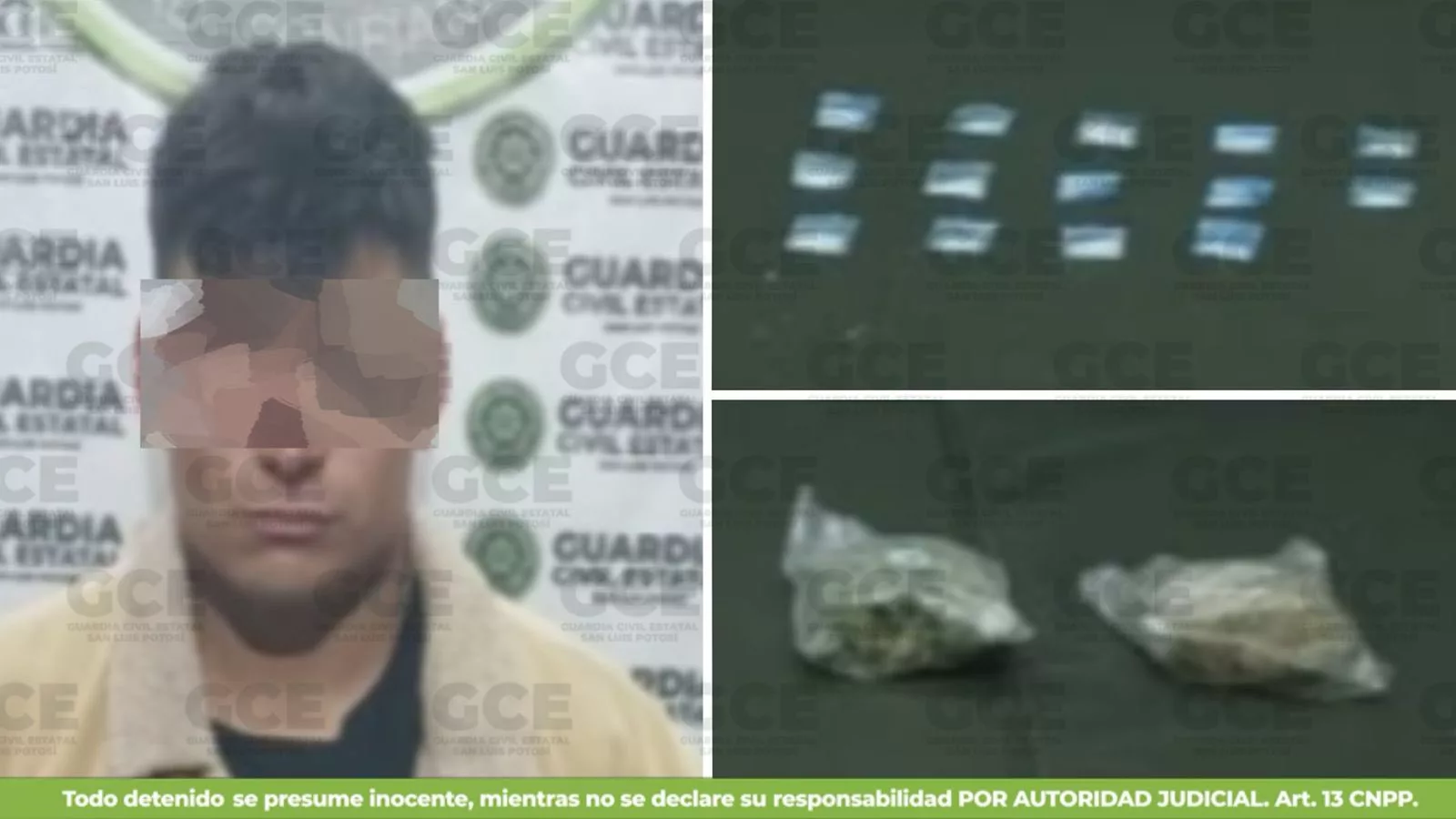 Otro de los hechos fue en el municipio de Santa María del Río, donde agentes estatales detuvieron a Juan «N» de 24 años, tras asegurarle dos bolsas con presunta marihuana y 14 dosis de una sustancia granulada conocida como «cristal».