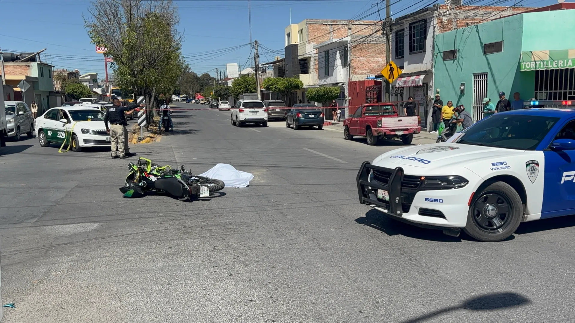 En el sitio, aun permanecía la unidad de transporte público, un Volkswagen Vento con distintivos verdes y blancos de SLP, presentaba daños en el costado derecho, responsable del suceso, mientras el cuerpo de la víctima fue cubierto con una sábana blanca a un costado de su vehículo, una motocicleta de bajo cilindraje.