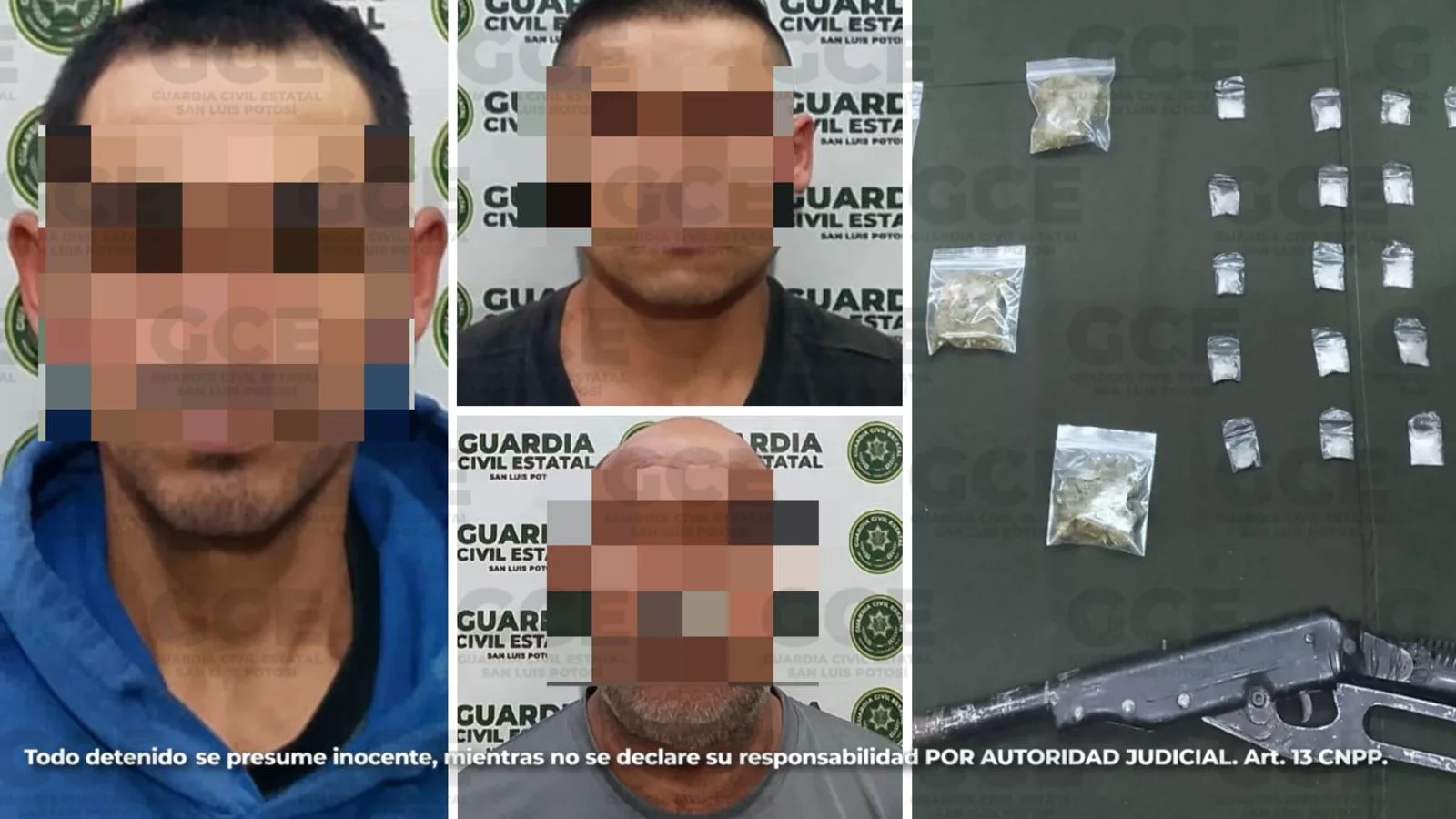 Un operativo coordinado entre la Guardia Civil Estatal y el Ejército mexicano en la capital potosina, permitió la detención de Cuauhtémoc “N” de 27 años, Gilbert “N” de 54 años y a Martín “N” de 32 años, quienes fueron ubicados con 20 dosis de “cristal”, cinco bolsas de marihuana y un arma de fuego artesanal en el fraccionamiento Constitución.