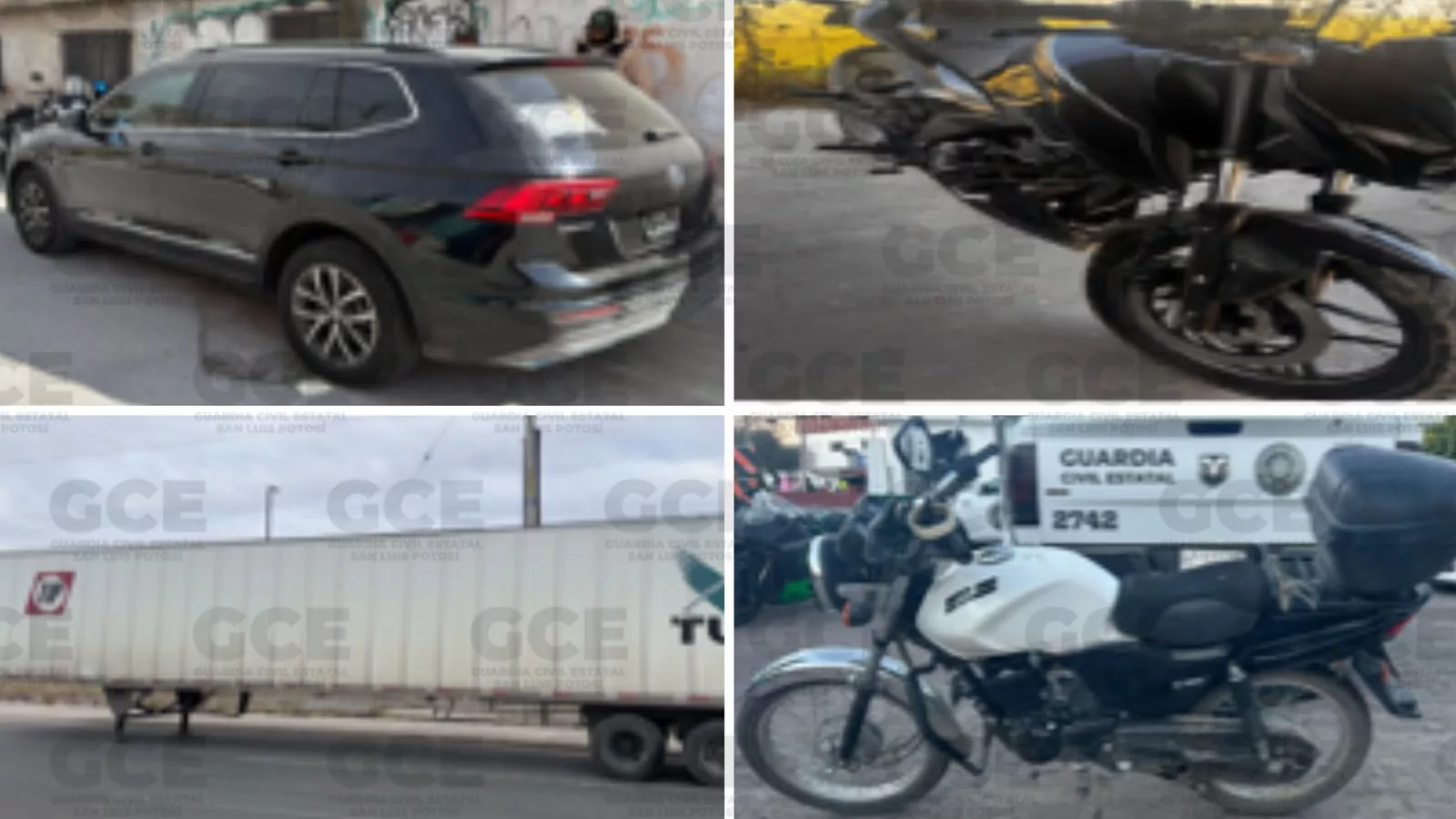 En la colonia 21 de Marzo en Soledad de Graciano Sánchez, los uniformados de la GCE localizaron una camioneta Vw Tiguan, modelo 2018 en color negro que al ser consultada arrojó reporte de robo con violencia el 04/05/2023 en el Estado de México. En la Delegación de La Pila, se recupera una caja seca modelo 2015 con reporte de robo con violencia el 31/01/2026. en, Villa Hidalgo, S.L.P.