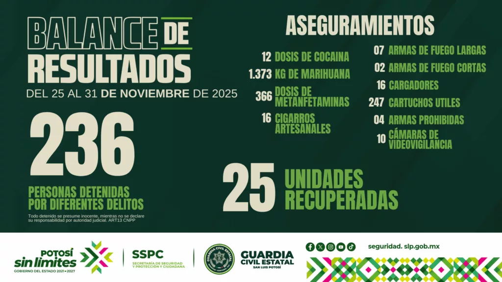 Dentro del Plan Integral de Seguridad, la corporación estatal informó que se detuvo a 236 personas, por su posible participación en diferentes actos ilícitos, entre ellos delitos del rubro federal y del fuero común. Además, indicaron que, como resultado de las labores de coordinación interinstitucional, se aseguraron 21 automotores y vehículos de carga, así como cuatro motocicletas, dando un total de 25 unidades recuperadas, mismas que fueron reportadas como robadas.