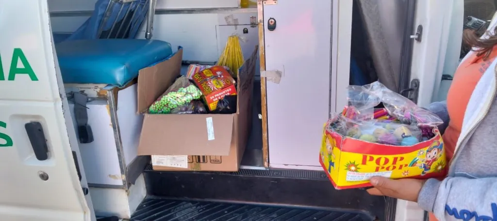 Durante la inspección en el mercado ubicado sobre la calle Capitán Caldera, personal de Protección Civil detectó en un puesto ambulante una caja con diversos juegos pirotécnicos, cuyos encargados no contaban con los permisos correspondientes para su venta y distribución. Ante esta situación, se solicitó el apoyo de los agentes municipales, quienes informaron sobre los riesgos que representa el manejo de este tipo de material y se procedió al retiro inmediato.