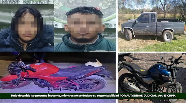 Como resultado de los trabajos enfocados en preservar la paz y salvaguardar el patrimonio de la población, agentes de la Guardia Civil Estatal y del C5i2, reportaron la detención de Carmen “N” de 23 años y de Jorge “N” de 29 años, luego de que se les asegurara una motocicleta marca Hero Hunk, color rojo con negro, modelo 2022, que tenía reporte de robo de la colonia Villa de los Cactus, al oriente de la zona metropolitana.