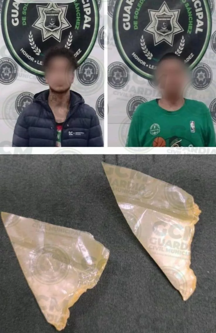 Josué «N» y Bryan «N», ambos de 23 años, fueron detectados en Avenida Cactus, en la colonia Cactus cuando incurrían en faltas al Bando de Policía y Gobierno, localizándoles un envoltorio con piedra granulada semejante a la metanfetamina llamada «cristal» a cada uno.
