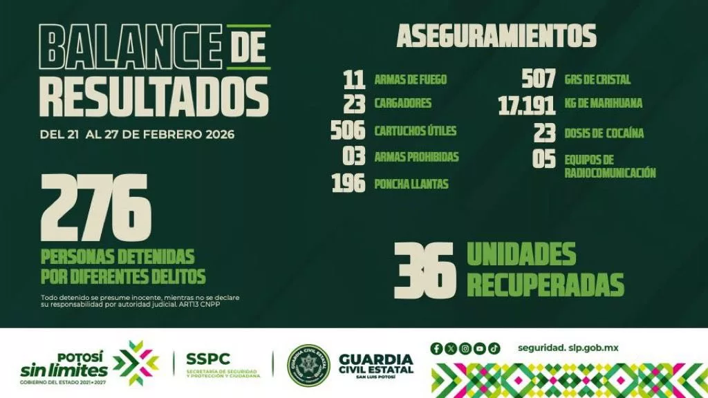 Del 21 al 27 de febrero, la Guardia Civil Estatal (GCE) detuvo a 276 personas que quedaron a disposición de la Fiscalía General del Estado o Fiscalía General de la República, por su posible participación en diferentes hechos constitutivos de delito, además de que localizó y recuperó 27 automotores y nueve motocicletas con reporte de robo.