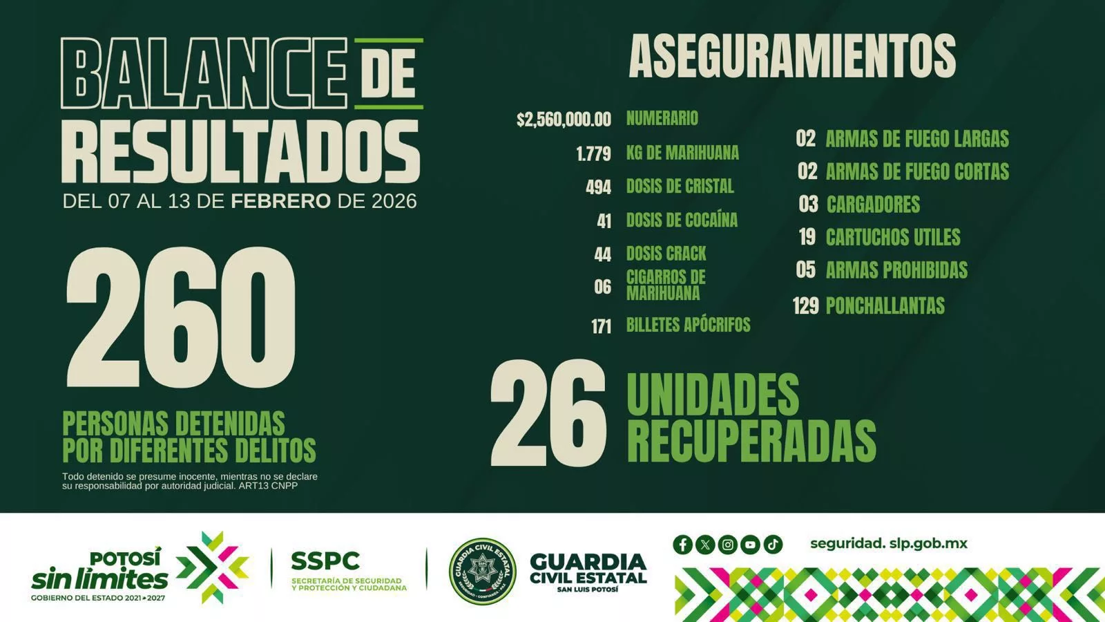 Dentro del despliegue del Plan Integral de Seguridad, nuestros oficiales de la Guardia Civil Estatal detuvieron a 260 personas, quienes posiblemente están vinculados en diversas actividades constitutivas de delito, entre ellas 13 quedaron a disposición de la Fiscalía General de la República, 245 ante la Fiscalía General del Estado y dos al Juez Cívico Calificador, por faltas administrativas.