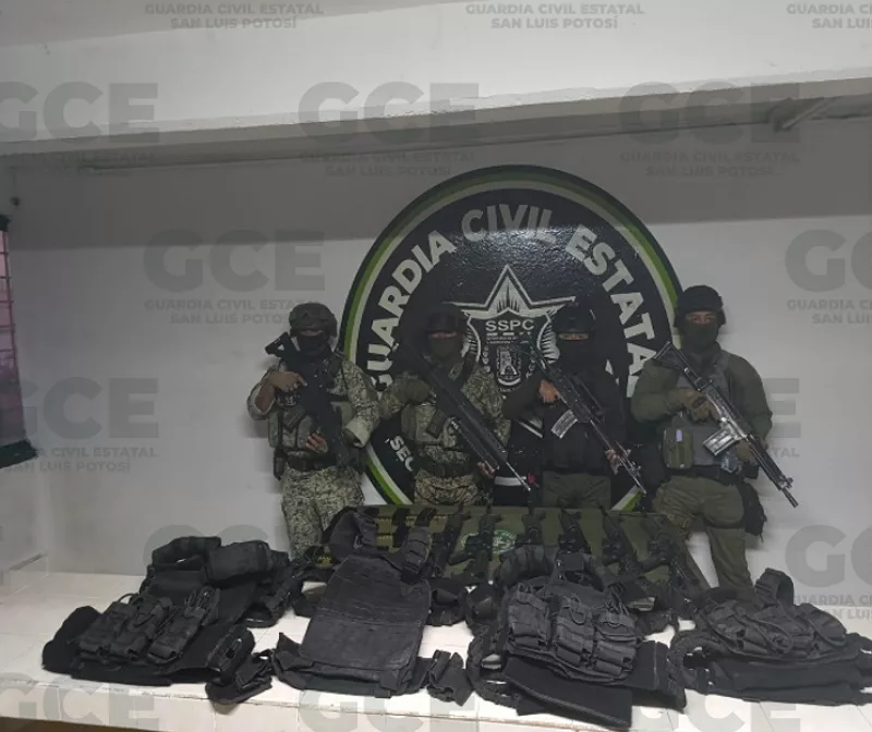 Los dispositivos de seguridad en coordinación con la Guardia Nacional, dentro del dispositivo Base de Operaciones Mixtas Interinstitucional (BOMI) en el municipio de Matehuala, permitieron que nuestros elementos, aseguraran en Camino a San José del Plan, una camioneta Dodge Ram doble cabina color blanco, en la cual se encontraron seis armas largas calibre 5.56 milímetros, 10 cargadores, siete chalecos tácticos y 100 cartuchos útiles calibre .223/5.56.