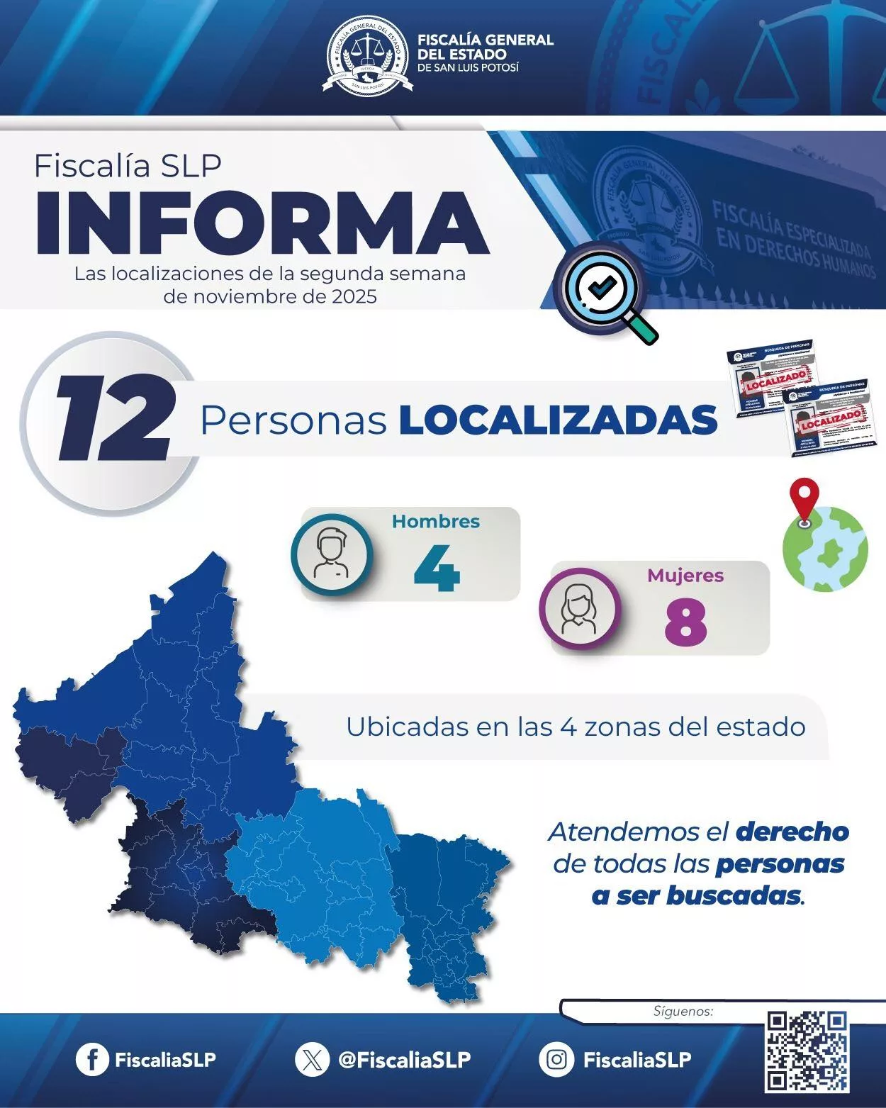 La Fiscalía General del Estado de San Luis Potosí (FGESLP), a través de la Fiscalía Especializada en Materia de Derechos Humanos, localizó a 12 personas durante la segunda semana de noviembre.