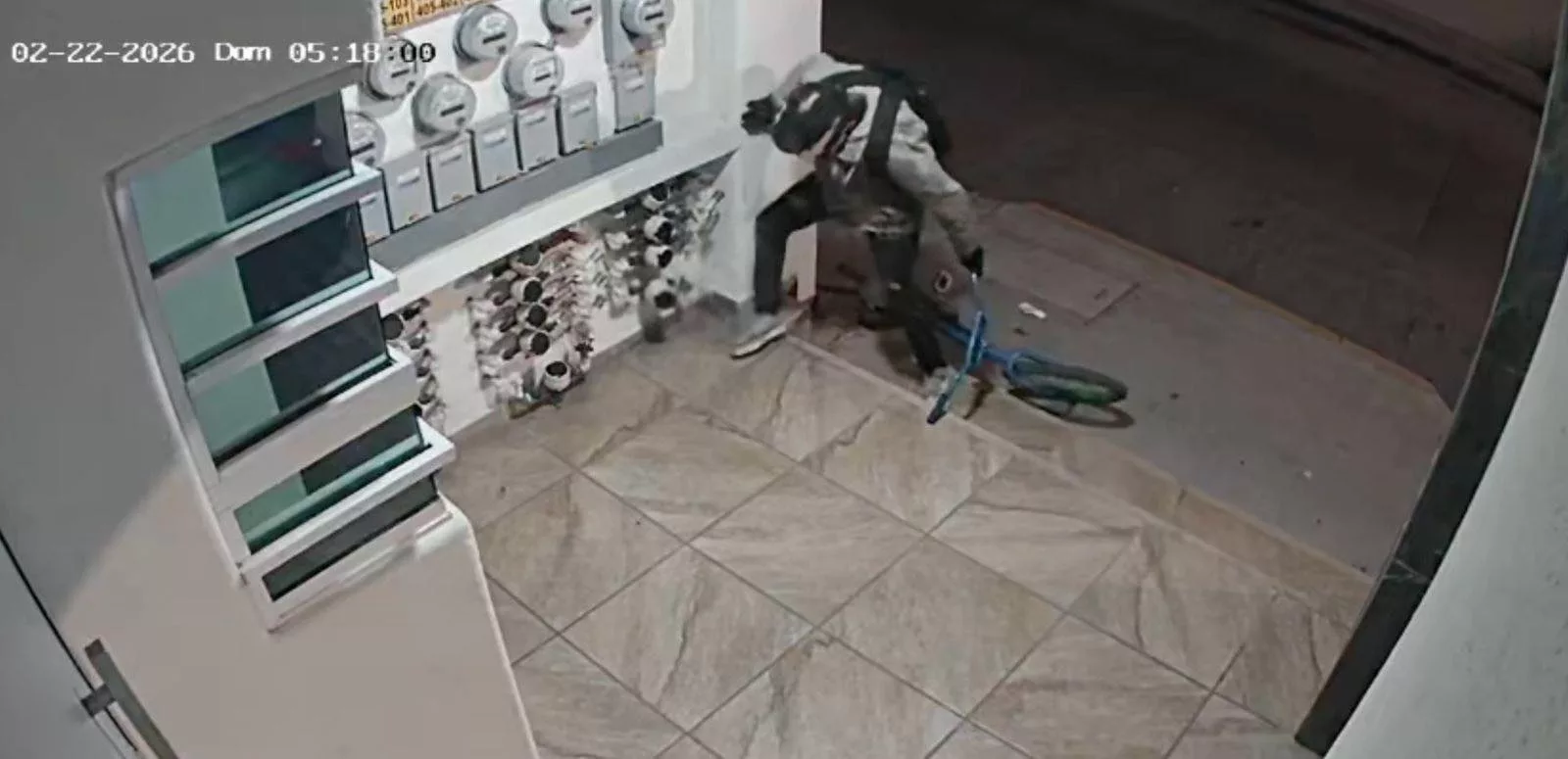 Videos de cámaras de vigilancia en edificios de la zona muestran a un hombre que, a bordo de una bicicleta, patea los medidores y posteriormente se lleva la estructura de plástico.