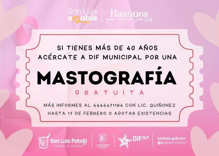 Como parte de las acciones prioritarias del Gobierno de la Capital para proteger la salud de las mujeres potosinas, el Alcalde Enrique Galindo Ceballos respalda la entrega de vales para mastografías gratuitas a través del DIF Municipal de San Luis Potosí, gracias al apoyo solidario de Red Ambiental.