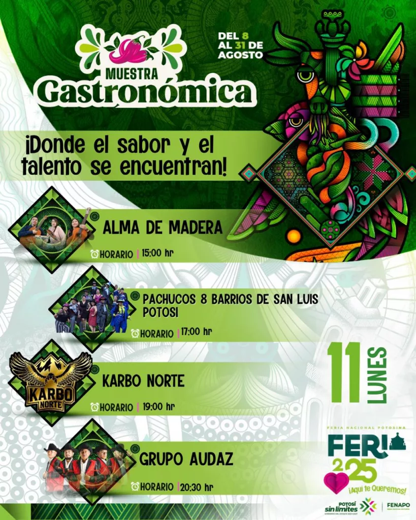 En la Muestra Gastronómica, el público degustará de sabores típicos con presentaciones de Alma de Madera, Karbo Norte, Grupo Audaz y la Asociación de Pachucos y Jainas de San Luis Potosí, quienes llevarán su estilo y alegría a este espacio.