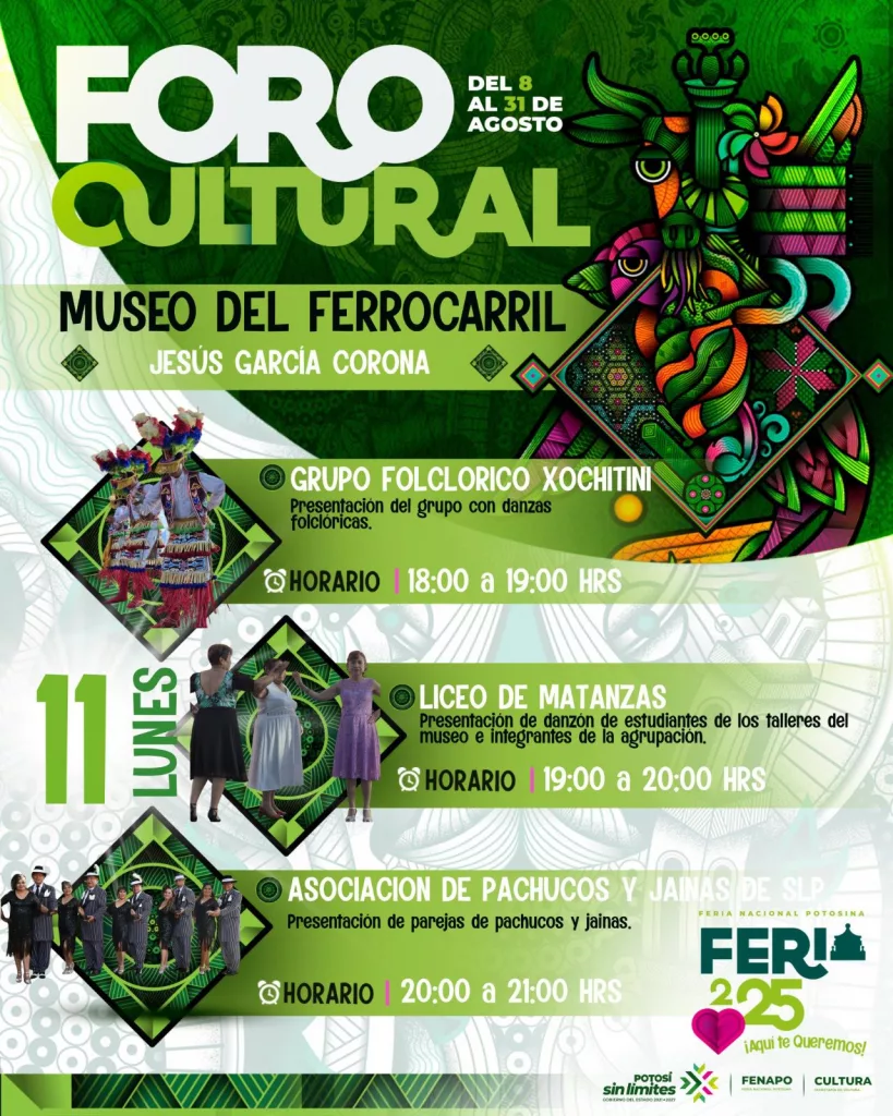 El Foro Cultural recibe al Grupo Folclórico Xochitini, al Liceo de Matanzas y nuevamente a la Asociación de Pachucos y Jainas de San Luis Potosí, que llenarán de color, música y baile este escenario. Cada presentación está pensada para que las y los asistentes vivan experiencias artísticas únicas, sumando propuestas para todas las edades en un ambiente seguro y festivo.