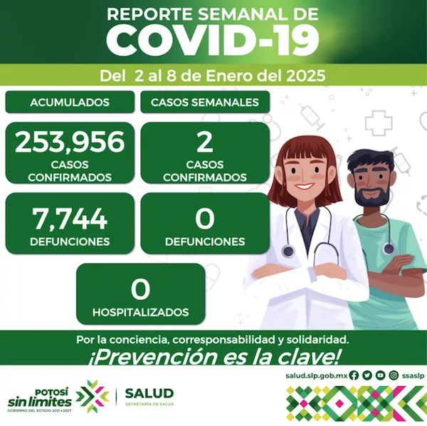 Del 2 al 8 de enero del presente año, se registraron 2 nuevos contagios de COVID-19 confirmando el Comité Estatal para la Seguridad en Salud y los Servicios de Salud 34 casos del virus de octubre que inició la temporada invernal a este 8 de enero, para un total de 253 mil 956 casos de esta enfermedad en el estado.