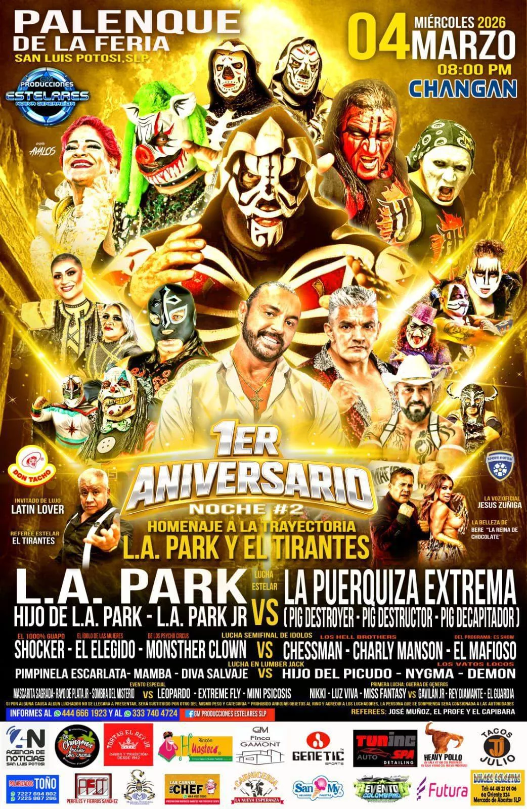 El miércoles 4 de marzo el Palenque recibirá una función de lucha libre con figuras nacionales e internacionales, Latin Lover, Shoker, la poderosa Real Familia L.A. Park enfrentando a la Puerkisa Extrema, además de Pimpinela Escarlata, Mamba, Diva Salvaje y los Vatos Locos Forever, mientras que el 7 de marzo la música regional tomará el escenario con un concierto que reunirá a El Coyote y Chuy Lizárraga. La cartelera se complementa el 8 de marzo con el Demolition Derby MX, espectáculo automovilístico que promete un ambiente familiar y lleno de emoción.