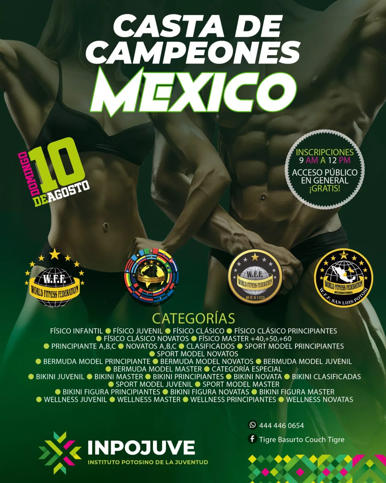El Instituto Potosino de la Juventud (Inpojuve), en colaboración con la World Fitness Federation (WFF), presenta el Mister San Luis 2025–Casta de Campeones, una competencia que celebra la pasión por el fisicoculturismo y que se realizará este domingo 10 de agosto.