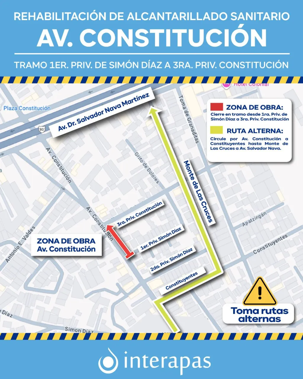 SLP.– INTERAPAS comenzó los trabajos de rehabilitación del drenaje sanitario en la avenida Constitución, entre la Tercera Privada de Constitución y la Primera Privada de Simón Díaz, en la colonia Santa Fe.