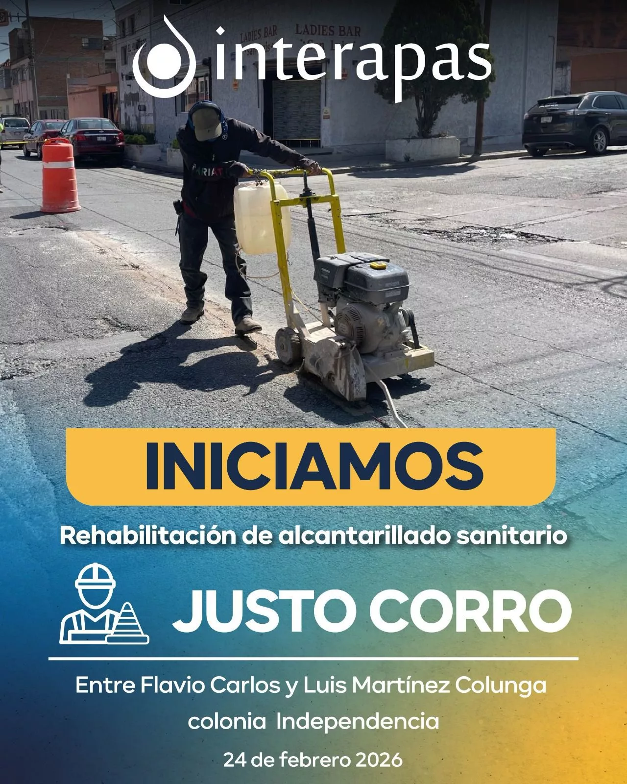 Interapas trabaja en la rehabilitación del alcantarillado sanitario sobre la calle Justo Corro en la colonia Independencia, en la zona centro-sur de la ciudad, una intervención que había sido solicitada por vecinos ante las fallas en la red.