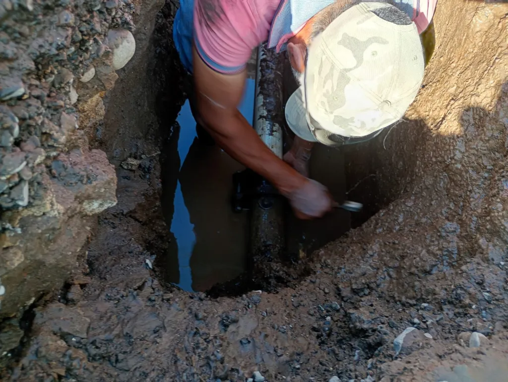 La falla se encontraba en una línea de 3 pulgadas. La intervención requirió maniobras cuidadosas debido a que el punto de la fuga coincidía con una toma domiciliaria, lo que hizo más complejo el trabajo técnico.
