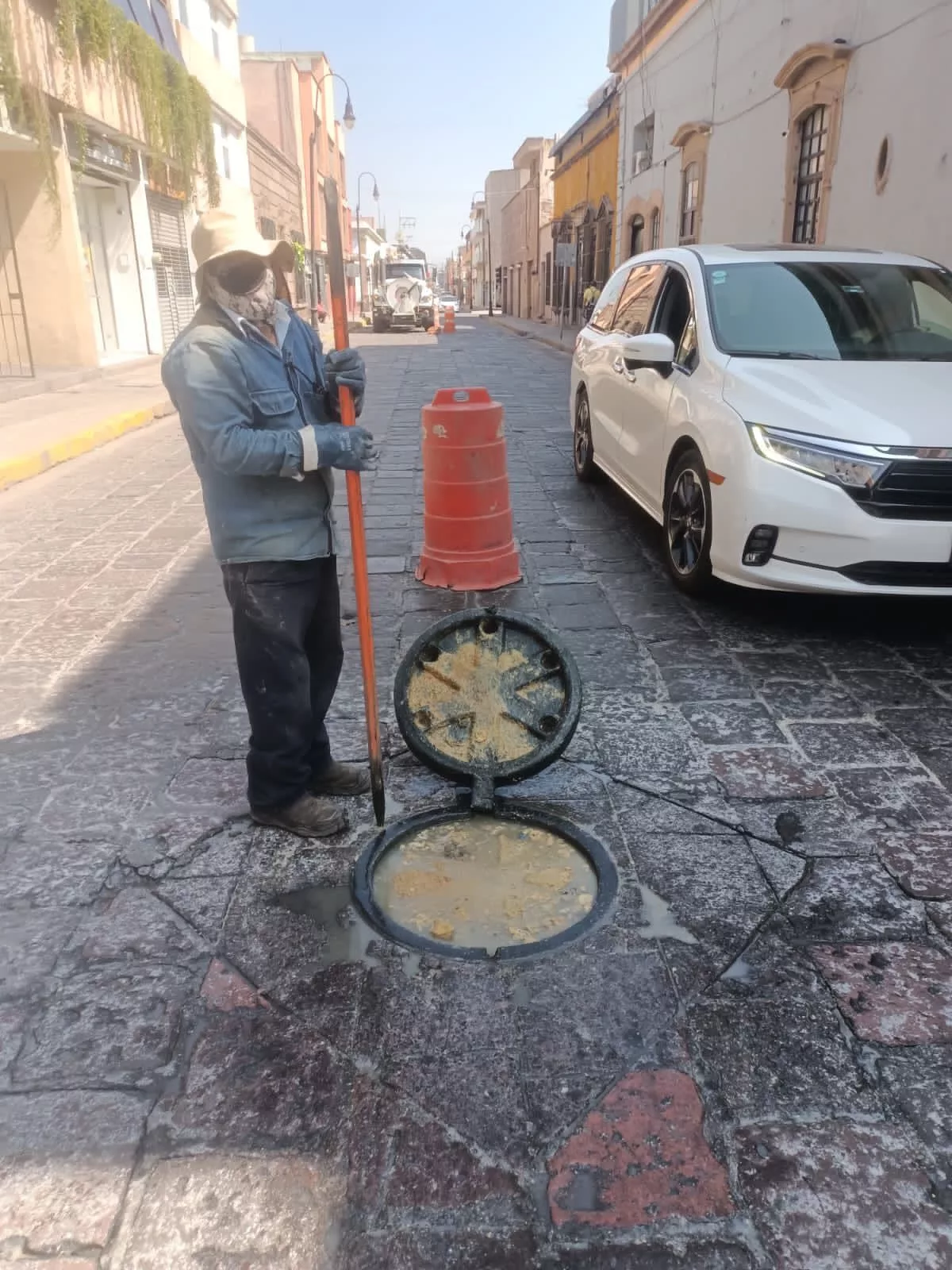 SLP.- Personal del organismo operador INTERAPAS realizó trabajos de limpieza en la red sanitaria sobre la calle Álvaro Obregón esquina con Independencia, en el Centro Histórico de la Capital.