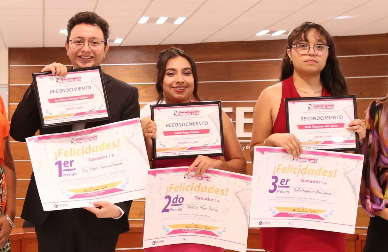 En su mensaje la presidenta consejera del CEEPAC Paloma Blanco López reconoció que la oratoria no solo es el arte de hablar bien, sino tambien la capacidad de construir puentes entre ideas y personas, “en una democracia la palabra es la vía por excelencia para debatir, proponer, discernir con respeto e inclusión, y son justamente las juventudes quienes, con su energía y su visión del futuro, pueden y deben revitalizar la vida política y fortalecer la participación ciudadana”.