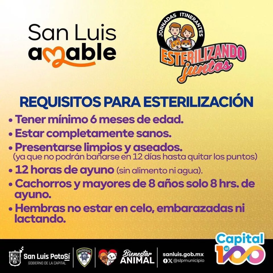 También es necesario que los animales cumplan con los requisitos, entre los que resaltan: Tener mínimo 6 meses de edad, estar completamente sanos, presentarlos limpios y aseados (ya que no podrán bañarse hasta 12 días después de la cirugía), cumplir con 12 horas de ayuno (sin alimento ni agua), aunque en el caso de cachorros o mayores de 8 años, sólo 8 horas de ayuno. En cuanto a las hembras no deben estar en celo, embarazadas ni lactando.