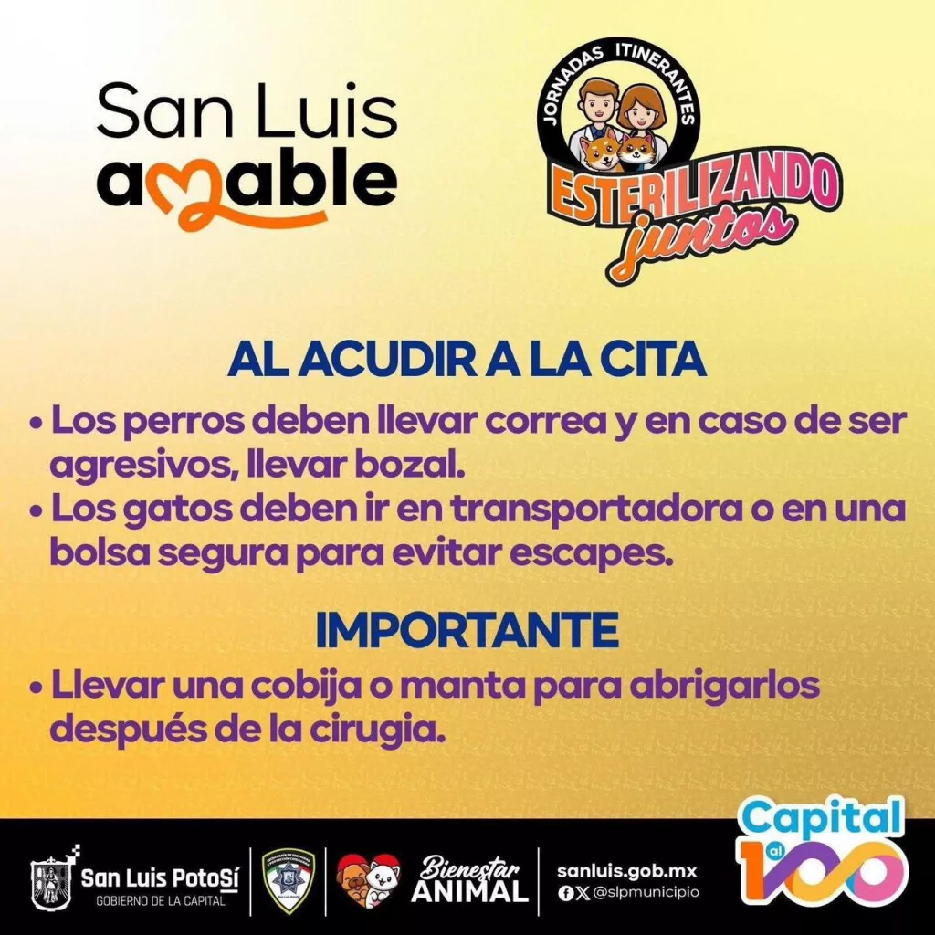Para garantizar la seguridad de todas y todos, se solicita que los perros porten correa y, en caso de ser agresivos o nerviosos, también bozal. Por su parte, los gatos deben llevarse en una transportadora o en una bolsa segura, con el fin de evitar cualquier intento de escape. Además, se pide a sus propietarias o dueños llevar una cobija o manta para mantener abrigados a sus animales de compañía tras la cirugía.