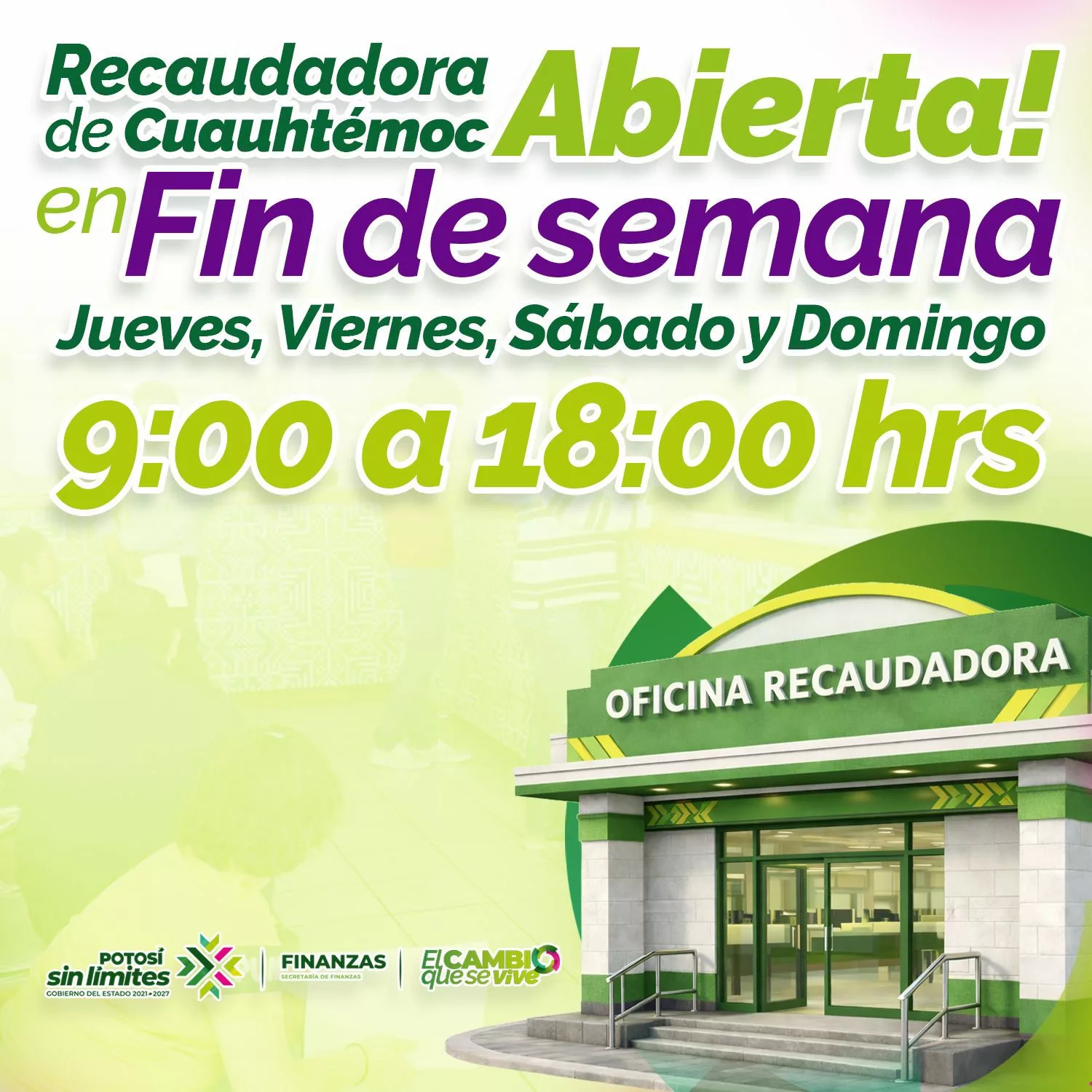 Bajo la encomienda del Gobernador Ricardo Gallardo Cardona de acercar los servicios a la ciudadanía, la Secretaría de Finanzas (Sefin) mantiene en operación la oficina recaudadora de Cuauhtémoc durante los Días Santos, facilitando la realización de trámites en horarios accesibles.