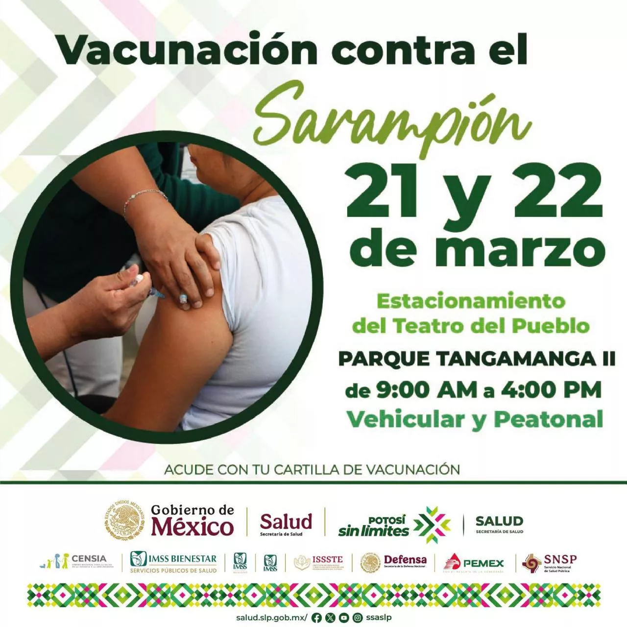 Bajo la encomienda del Gobernador Ricardo Gallardo Cardona, los Servicios de Salud alistan una jornada intensiva de vacunación contra el sarampión con un macromódulo vehicular y peatonal que se instalará los días 21 y 22 de marzo en el Parque Tangamanga II, de 9:00 a 16:00 horas. En coordinación con instituciones federales, se fortalece la atención preventiva con acciones sin límites para proteger la salud de las y los potosinos.
