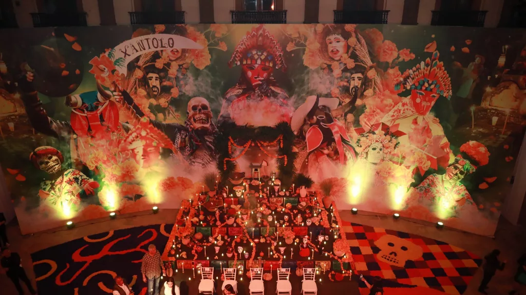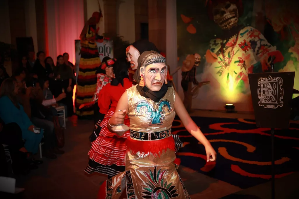 El Palacio de Gobierno se llenó de luz, color y fragancias, con la participación de comparsas tradicionales de la Huasteca y el altar que muestra siete niveles del viaje del alma, representando la travesía espiritual, incluyendo elementos como el agua, la sal, las velas y veladoras, el copal e incienso, las flores de cempasúchil y las calaveras, frutas, pan de muerto, papel picado y fotografías.