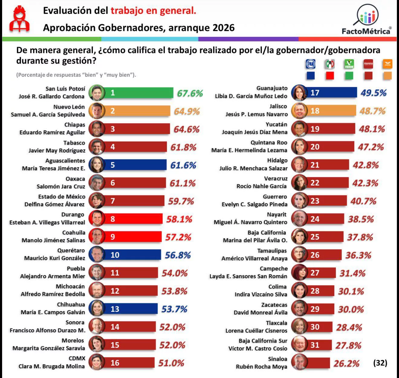 El gobernador de San Luis Potosí, Ricardo Gallardo Cardona, ha iniciado el 2026 consolidándose como uno de los mandatarios estatales con mayor respaldo ciudadano en México. De acuerdo con la más reciente encuesta de la firma Facto Métrica, Gallardo no solo destaca en los primeros puestos, sino que encabeza categorías clave de desempeño gubernamental.