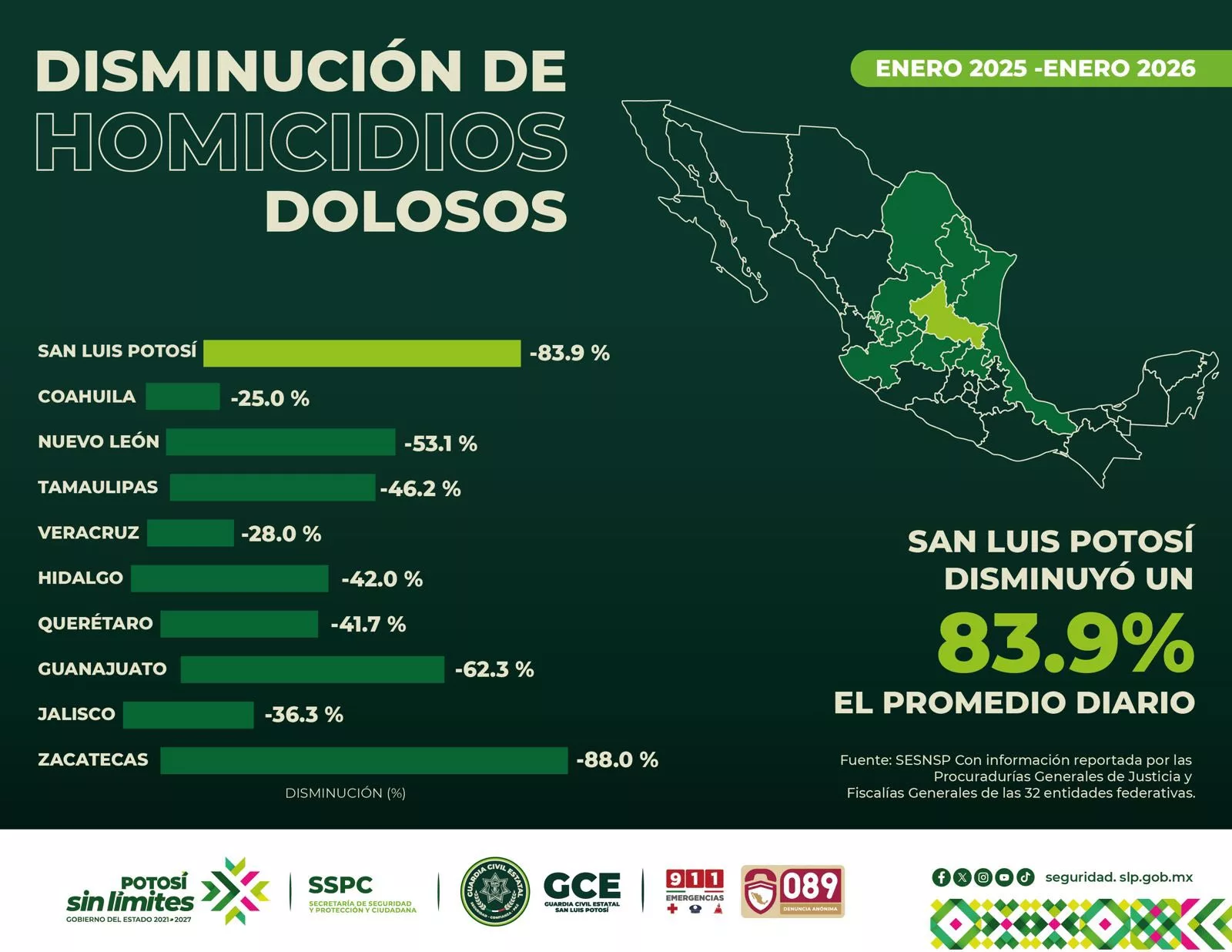 Resultado del trabajo sin límites y la estrategia integral de seguridad impulsada por el Gobernador Ricardo Gallardo Cardona, el Secretariado Ejecutivo del Sistema Nacional de Seguridad Pública dio a conocer que San Luis Potosí es la cuarta Entidad con menor número de homicidios dolosos a nivel nacional durante el mes de enero de 2026, además del primer lugar nacional en detenciones por narcomenudeo.