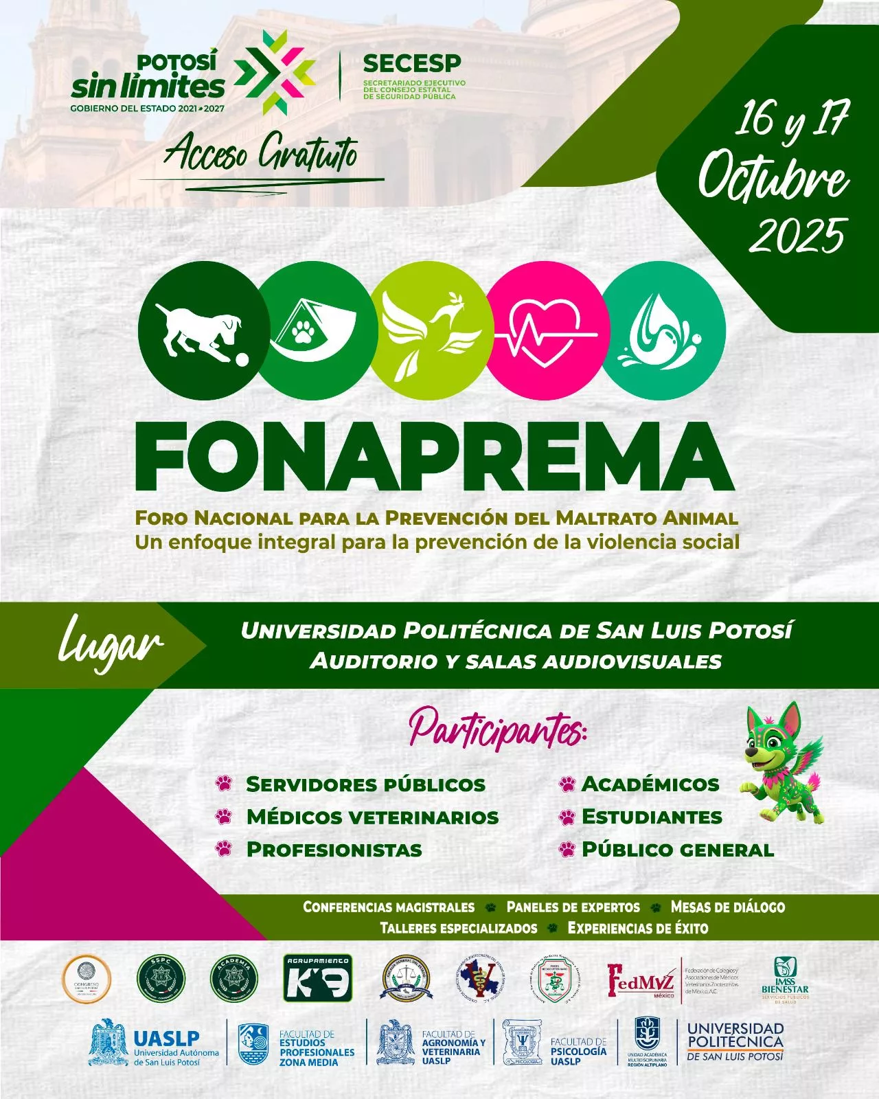 El foro se llevará a cabo los días 16 y 17 de octubre en la Universidad Politécnica de San Luis Potosí, con entrada gratuita y registro previo en http://fonaprema.littsw.com. Participarán expertas y expertos como Lucía Gabriela Rosales, Martín Dávila, Angélica Hernández y Esaú Monsiváis, quienes abordarán temas clave como la salud mental, el enfoque “Una sola salud” y la valoración clínica del animal maltratado.