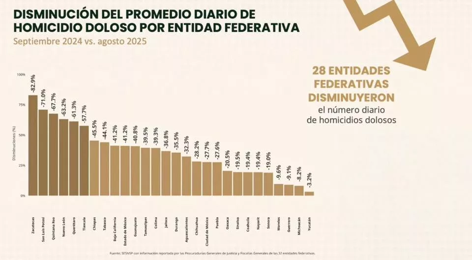 Derivado de la estrategia integral de seguridad implementada por el Gobierno del Estado, San Luis Potosí se ubica como la segunda entidad federativa con mayor disminución en el promedio diario de homicidios dolosos, al registrar una reducción del 71 por ciento en el periodo comprendido entre septiembre de 2024 y agosto de 2025.