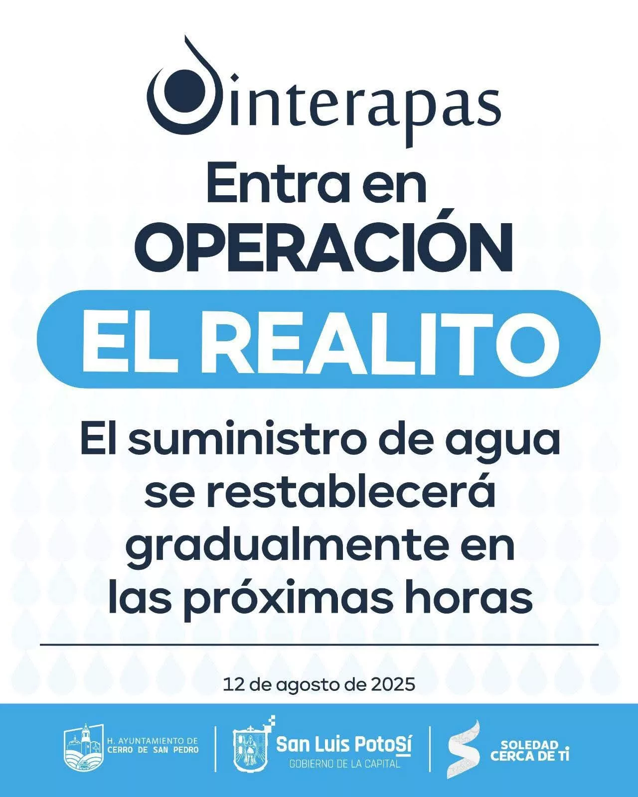 SLP.- A partir de este martes comenzó a registrarse nuevamente el ingreso de agua proveniente de “El Realito” a los tanques de almacenamiento, lo que permitirá la restitución gradual del suministro a colonias del sur y oriente de la capital.