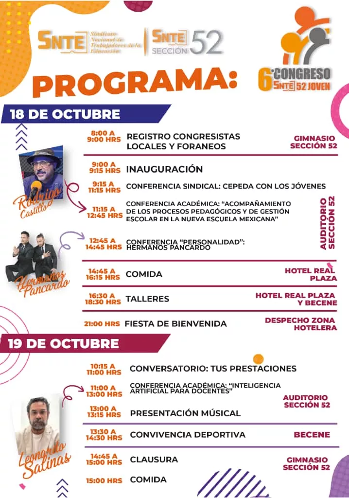 El Congreso se desarrollará en las instalaciones de la Sección 52, en la Benemérita y Centenaria Escuela Normal del Estado y en el Hotel Real Plaza, espacios que servirán de escenario para conferencias, talleres y dinámicas formativas centradas en la tecnología educativa, la comunicación asertiva, el bienestar emocional y la acción colectiva.