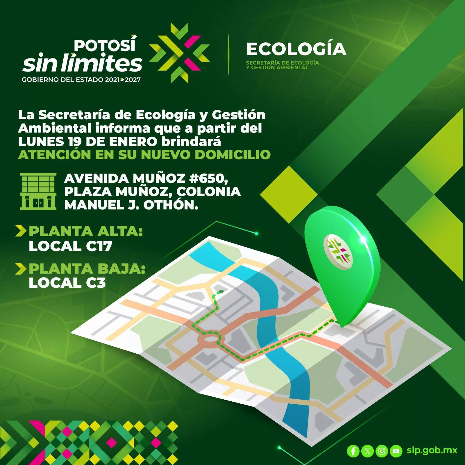 Para fortalecer la atención y apoyo sin límites a la ciudadanía, la Secretaría de Ecología y Gestión Ambiental (Segam) iniciará operaciones en nuevas oficinas a partir del 19 de enero, ubicadas en Plaza Muñoz, sobre Avenida Muñoz número 650, en la colonia Manuel J. Othón, dentro de su horario habitual.