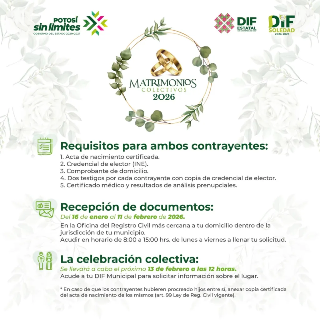 Con el objetivo de fortalecer el valor de la familia y ofrecer protección legal a las parejas, en el marco del Día del Amor, el Ayuntamiento de Soledad de Graciano Sánchez, a través del Sistema Municipal para el Desarrollo Integral de la Familia (DIF), llevará a cabo su programa “Matrimonios Colectivos 2026”, un programa en coordinación con el Sistema Estatal DIF, mediante el cual las parejas pueden unirse legalmente sin costo alguno.