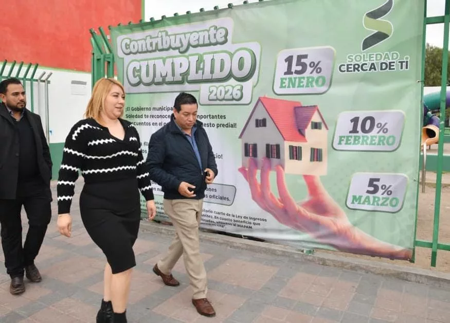 Con el arranque del año y con el objetivo de apoyar la economía de las familias, el Ayuntamiento de Soledad de Graciano Sánchez tiene todo listo para poner en marcha el programa de descuentos en el pago del impuesto predial “Contribuyente Cumplido 2026”, que iniciará este viernes 02 de enero, ofreciendo incentivos directos a quienes cumplen puntualmente con esta obligación; esta estrategia forma parte de una política municipal cercana, sensible y ordenada, impulsada el Alcalde Juan Manuel Navarro Muñiz, enfocada en facilitar trámites y fortalecer los servicios públicos para toda la población.