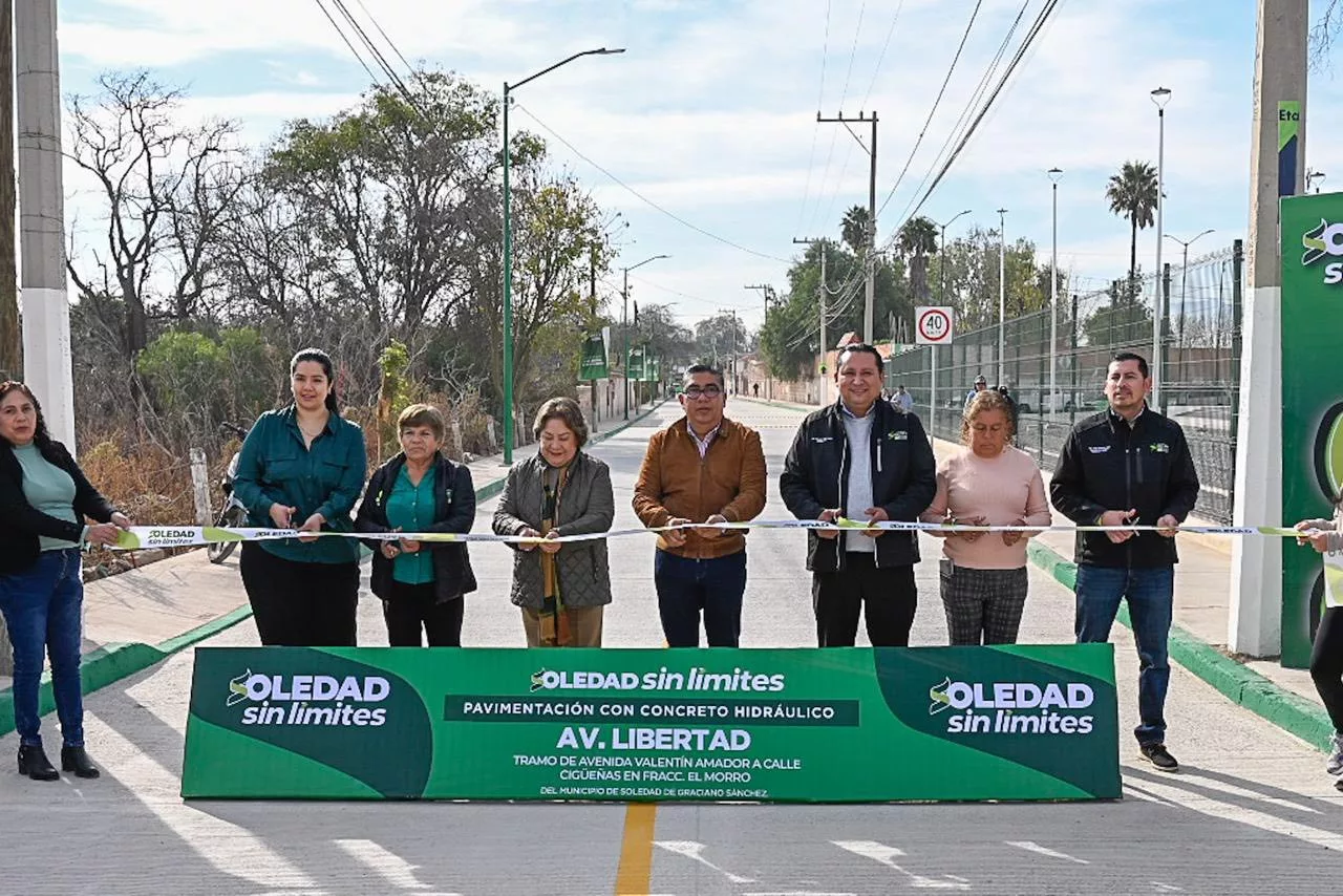 Juan Manuel Navarro Muñiz, Alcalde de Soledad de Graciano Sánchez, realizó este lunes el corte de listón inaugural para la entrega de la obra de pavimentación con concreto hidráulico e instalación de alumbrado tipo led de la avenida Libertad, en el tramo de avenida Valentín Amador a calle Cigüeñas, en el fraccionamiento El Morro, con una inversión de más de 9.5 millones de pesos; importante renovación que beneficia de manera directa e indirecta a más de 26 mil habitantes, para fortalecer la movilidad urbana, la seguridad pública, la calidad de vida y el dinamismo económico local.