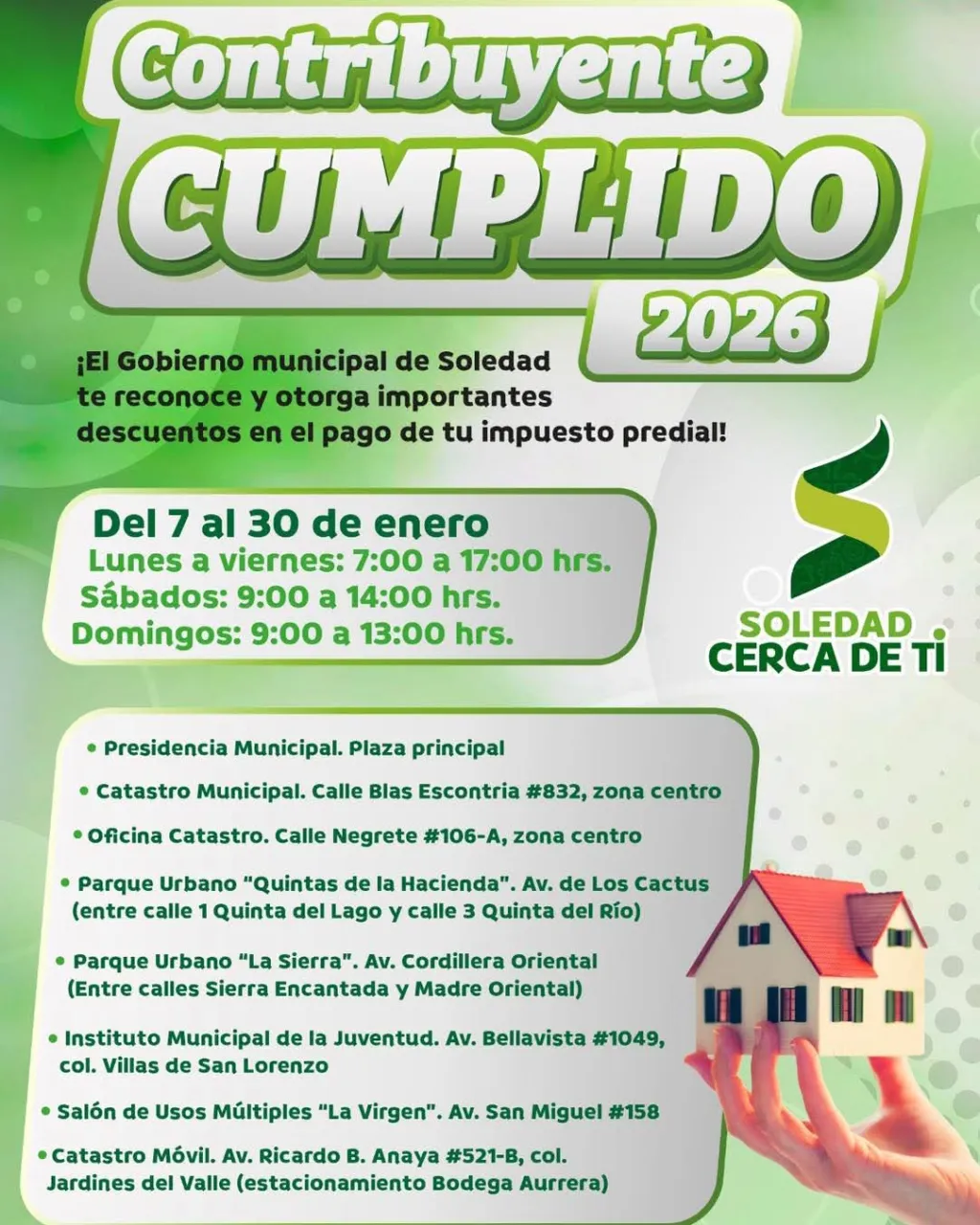 El incentivo más alto del año para el pago del impuesto predial se encuentra en su etapa final, y el Ayuntamiento de Soledad de Graciano Sánchez exhorta a la población a aprovechar el descuento del 15 por ciento vigente hasta el sábado 31 de enero, como parte del Programa Contribuyente Cumplido 2026 que coordina la Dirección de Catastro Municipal, beneficio que impacta de manera directa en la economía de las familias soledenses, siguiendo la línea de trabajo del Alcalde Juan Manuel Navarro Muñiz.