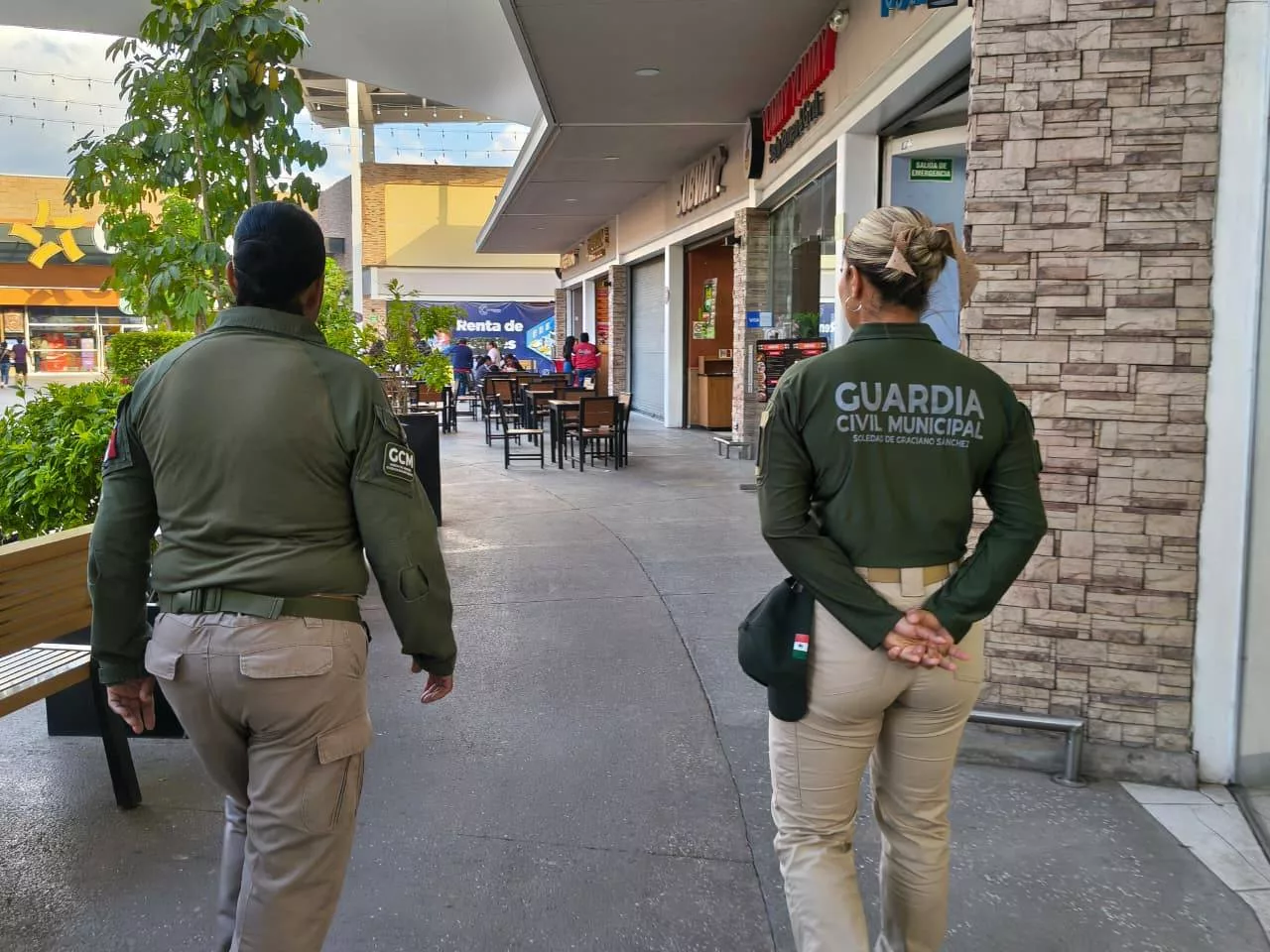 Como parte de esta estrategia, oficiales municipales realizan recorridos de prevención y vigilancia en plazas comerciales, sucursales bancarias y áreas de alta afluencia, con la finalidad de inhibir conductas delictivas, mantener el orden público y ofrecer apoyo inmediato a la población que lo requiera.