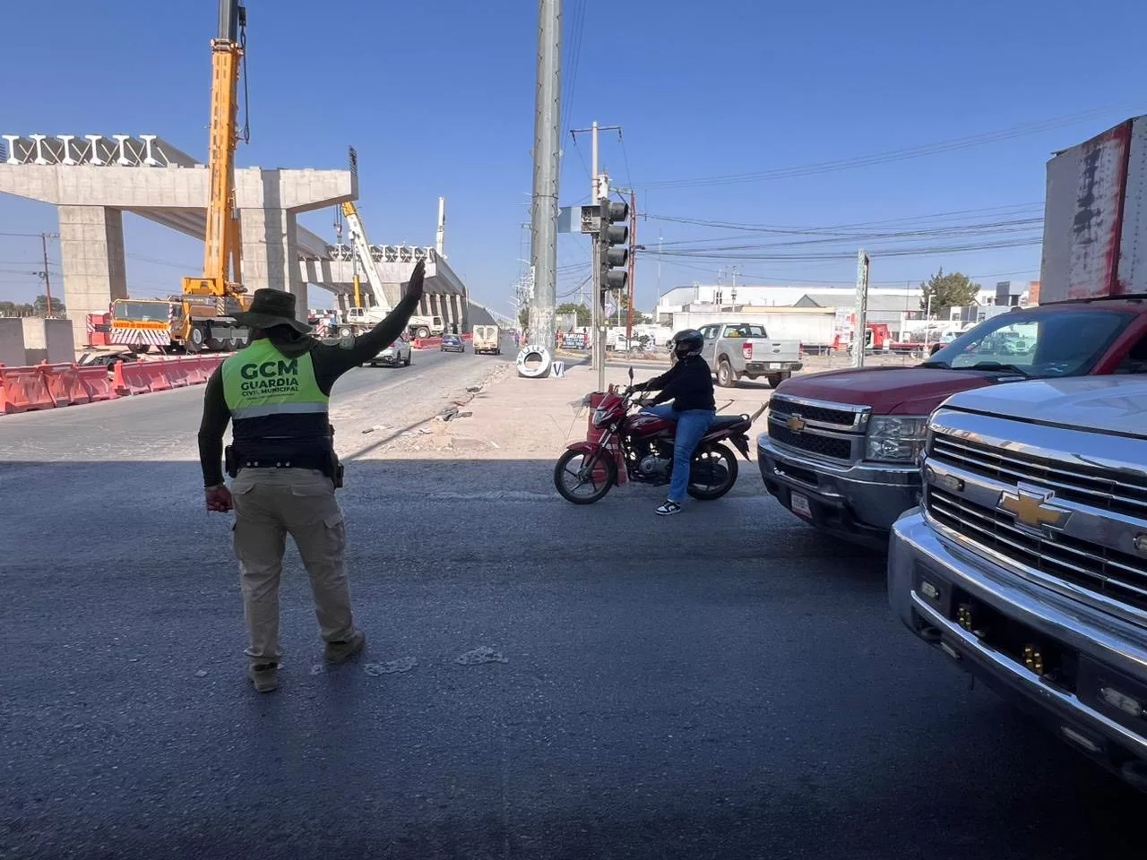 Con el objetivo de garantizar la seguridad vial de automovilistas y peatones y ordenar el tráfico, la Guardia Civil de Soledad de Graciano Sánchez, a través de la Dirección de Seguridad Vial y Movilidad, mantiene la presencia de oficiales para reducir los tiempos de espera y regular la circulación vehicular local y visitante, en la zona donde se construye el puente elevado en el cruce del Bulevar Valle de los Fantasmas y Circuito Potosí Oriente.