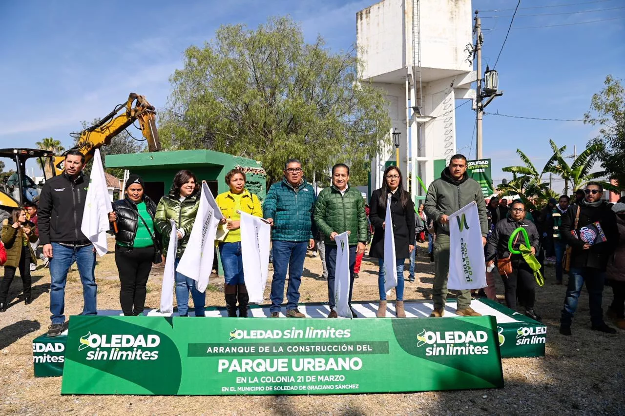 Juan Manuel Navarro Muñiz, Alcalde de Soledad de Graciano Sánchez, dio hoy el banderazo de arranque a una obra histórica y un gran anhelo social: la construcción del Parque Urbano en la colonia 21 de Marzo, con una inversión superior a los 9.3 millones de pesos que beneficiará de manera directa e indirecta a más de 14 mil 200 habitantes; este proyecto rescata un espacio abandonado y sin uso social, para convertirlo en un punto de encuentro seguro, cercano y digno para las familias, jóvenes, niñas, niños y adultos mayores del sector.