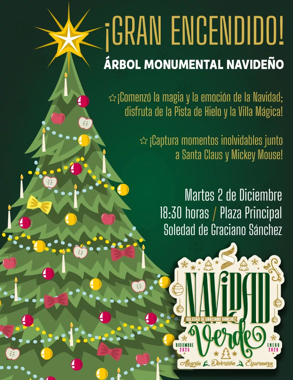 El Ayuntamiento de Soledad de Graciano Sánchez invita a todas las familias a reunirse este martes 2 de diciembre en la Plaza principal, para vivir junto al Alcalde Juan Manuel Navarro Muñiz, el mágico encendido del Árbol monumental, la Villa Navideña y el arranque de la Pista de Hielo, en un momento que busca llenar de luz, alegría y unidad el corazón del municipio.
