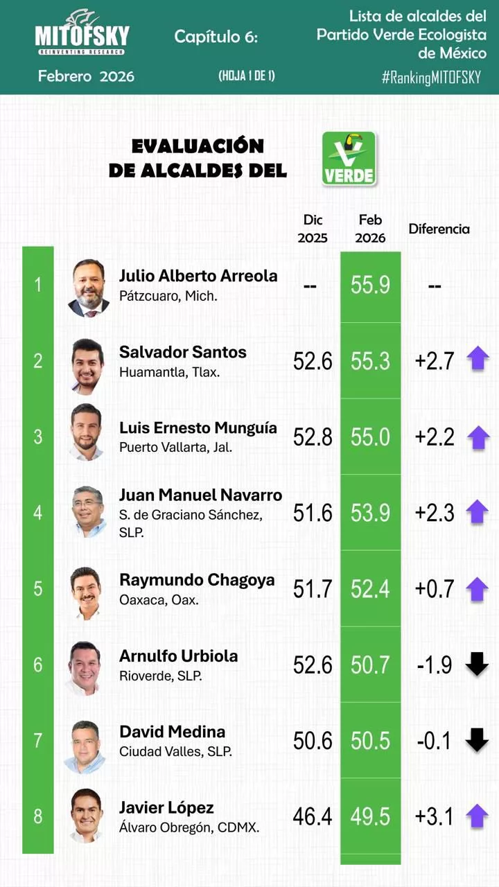 El informe también destaca que el alcalde de Soledad registró uno de los incrementos más importantes de aprobación entre los presidentes municipales del Partido Verde Ecologista de México, al pasar de 51.6 por ciento en diciembre de 2025 a 53.9 por ciento en febrero de 2026, lo que representa un crecimiento de 2.3 puntos porcentuales en la evaluación ciudadana.