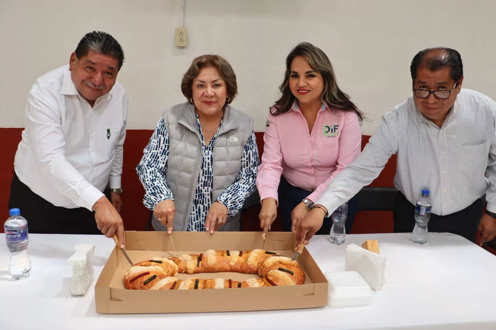El evento fue encabezado por el Subdirector de los Centros de Vida Sergio Contreras Flores, la Señora María del Pilar Cardona Reyna presidenta del DIF municipal de Soledad de Graciano Sánchez, Flor Olivia Gómez Vázquez coordinadora general de esta misma dependencia y como invitado especial René Contreras Flores director del Instituto Temazcalli quien se unió para repartir la rosca a todos los presentes.