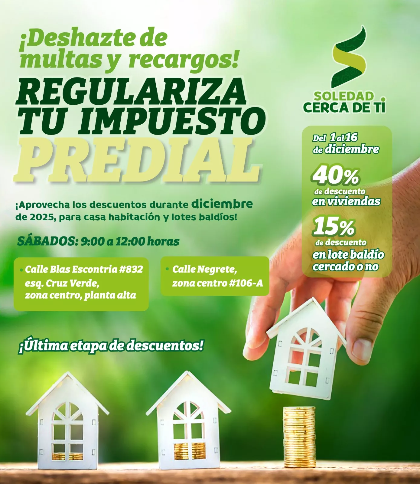 Desde el 1 al 16 de diciembre, los descuentos alcanzan el 40 por ciento para viviendas y el 15 por ciento para lotes baldíos para favorecer la participación ciudadana y fortalecer los servicios públicos en beneficio de toda la población soledense, tal como lo ha instruido el Alcalde Juan Manuel Navarro Muñiz, resaltó la directora de Catastro, Mayela Monserrat Martínez Martínez.
