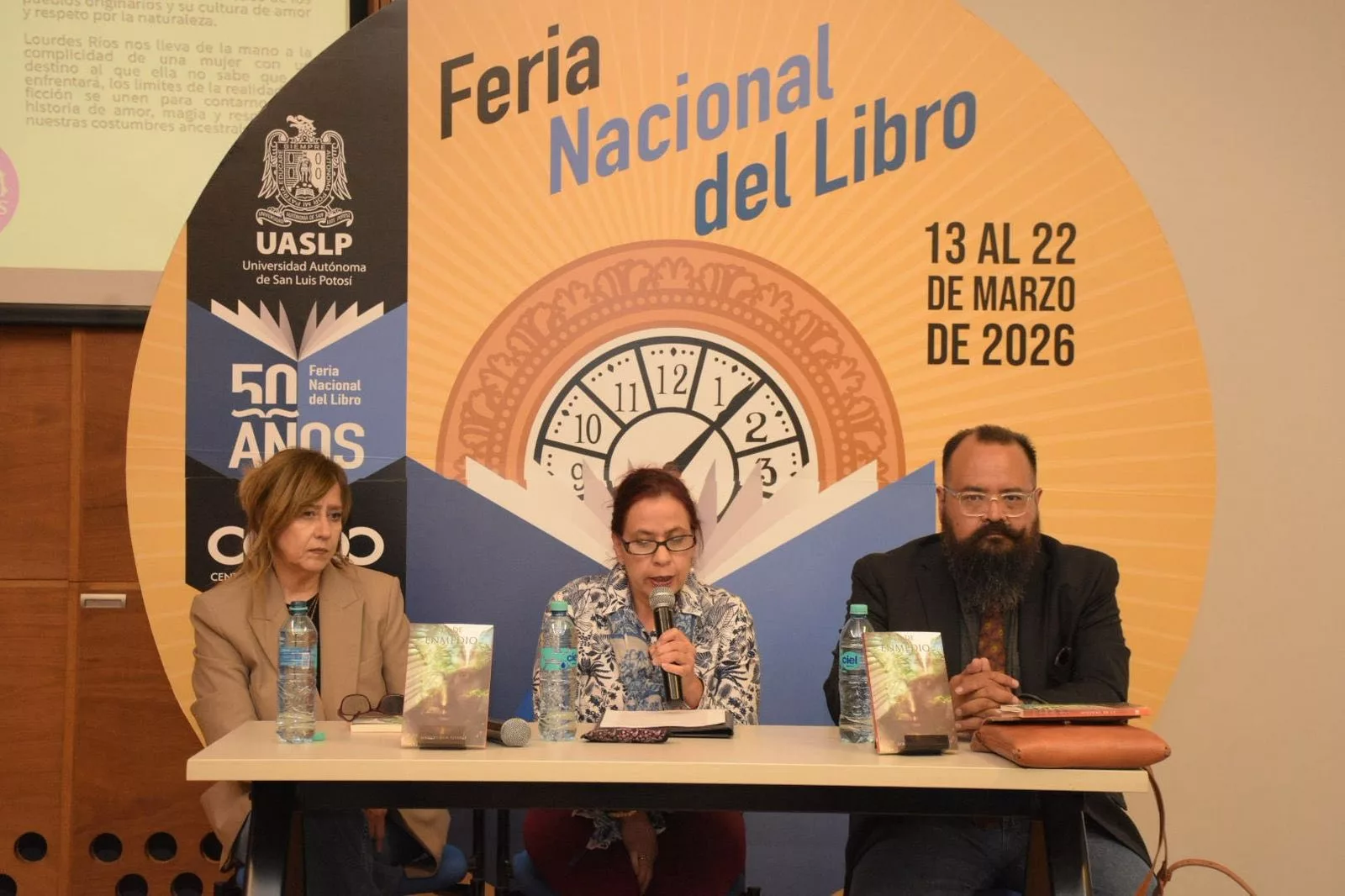 Por su parte, Lourdes Ríos presentó “La de Enmedio”, novela inscrita en el realismo mágico latinoamericano que narra la historia de Elisa, quinta hija de una familia de clase media en la Huasteca Potosina. La autora explicó que el título original era Sincretismo, debido al peso que tiene en la trama la fusión cultural entre tradiciones indígenas y mestizas. Sin embargo, decidió cambiarlo para centrar la mirada en su protagonista. “La palabra sincretismo me llevaba más al concepto social y no tanto a la historia de vida del personaje principal”, señaló.